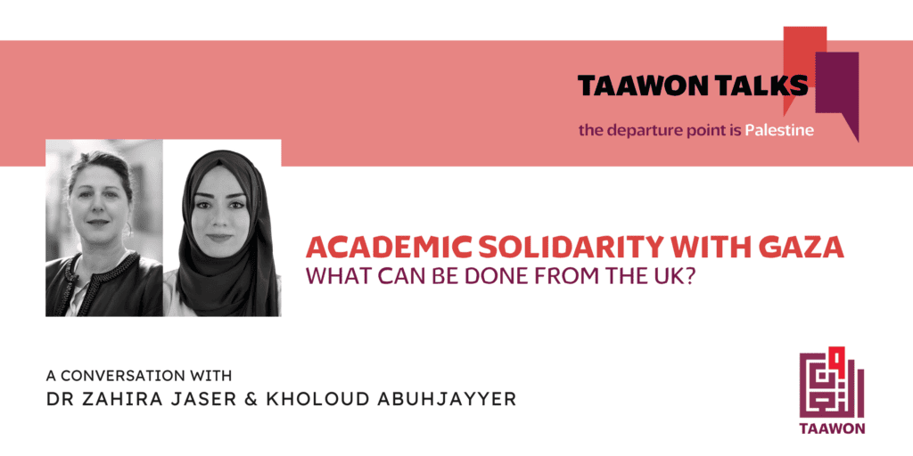 On Monday 9 of February, Taawon UK hosted an event marking two firsts for the podcast series Taawon Talks: the first episode to be recorded in the UK; and the first episode to be recorded in front of a live in-person audience. Scholar Zahira Jaser and recent graduate Kholoud Abuhjayyer engaged in conversation about academic solidarity, censorship and futures in the context of the struggle for liberty and life in Palestine.